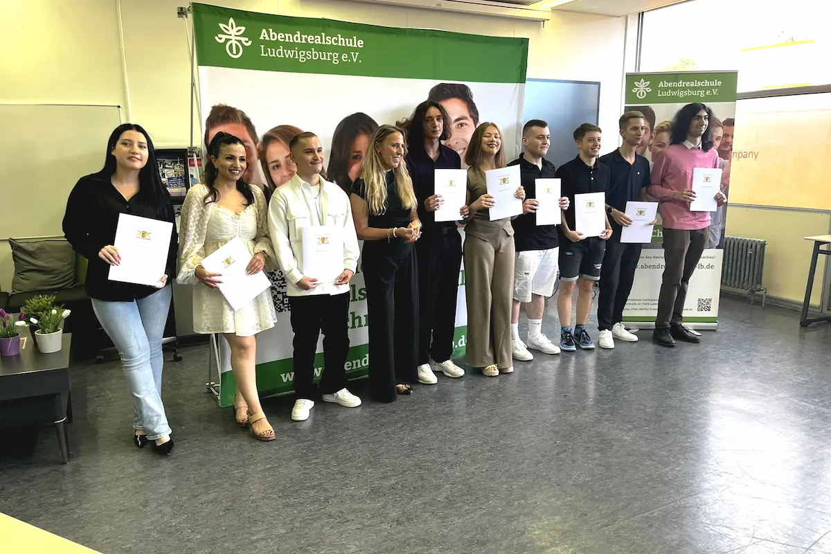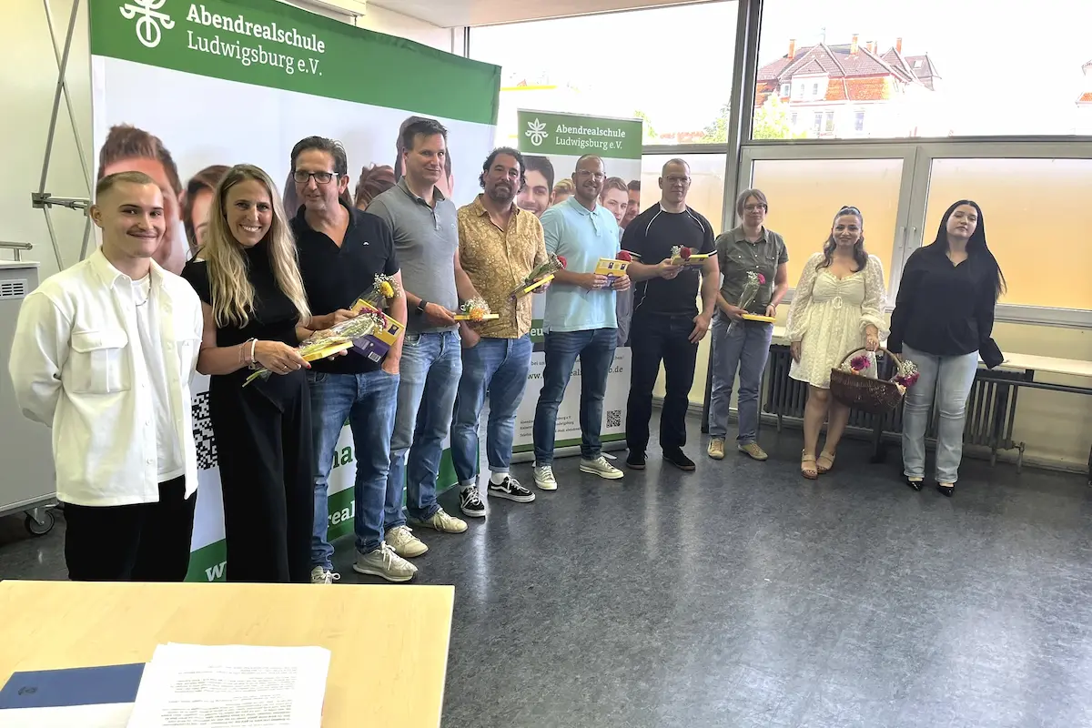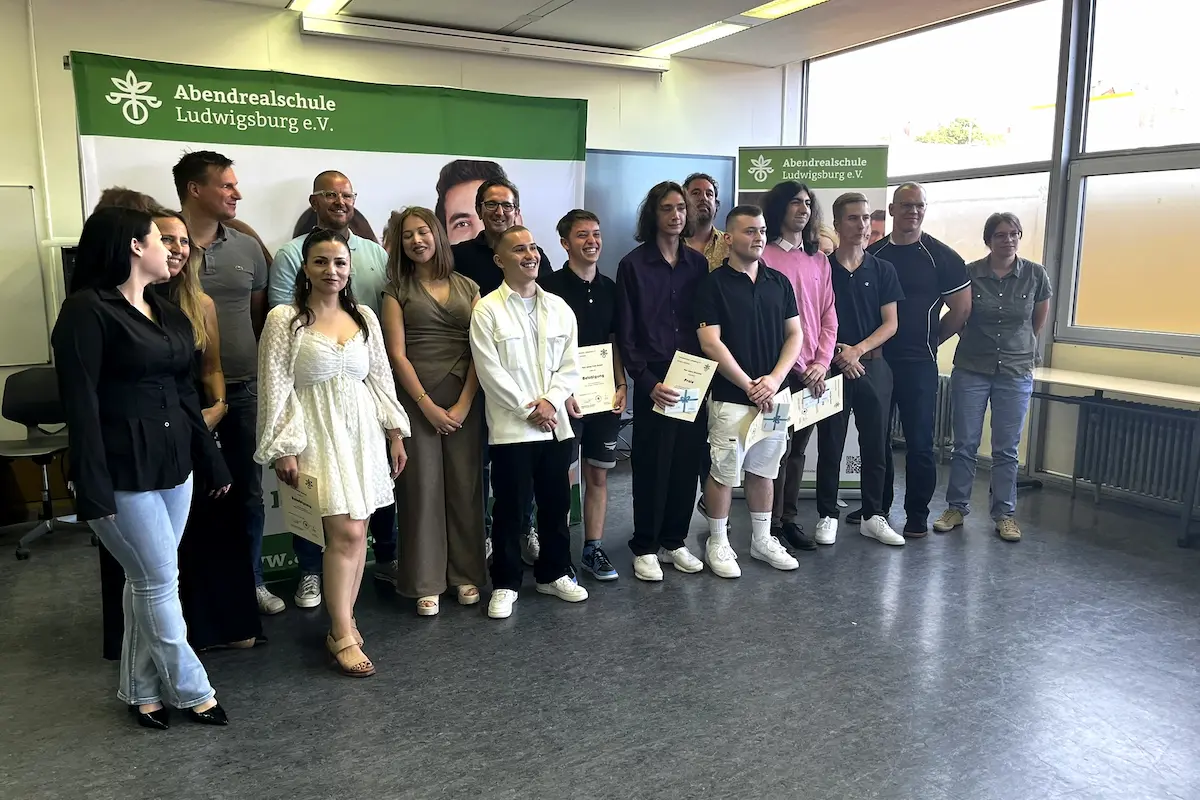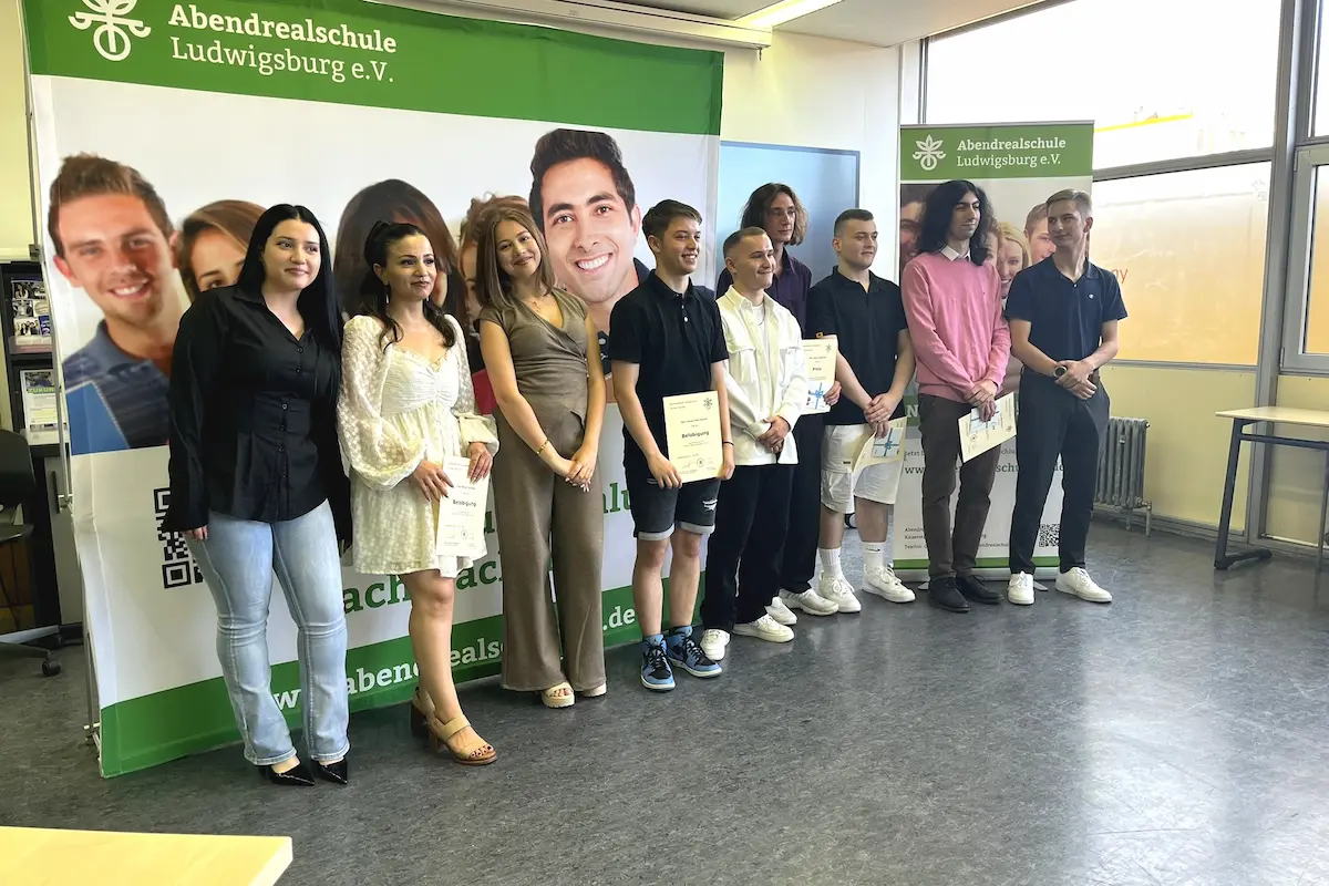 Mit strahlenden Gesichtern feierten die Absolventen in diesem Jahr ihren erfolgreichen Abschluss an der Abendrealschule Ludwigsburg. In zwei Jahren mit Unterricht am Abend und zumeist einer beruflichen Tätigkeit tagsüber zeigten die Schülerinnen und Schüler Ausdauer und Fleiß, um das Ziel zu erreichen. Mit einem Glas Sekt ließ sich trefflich darauf anstoßen, dass sich nun neue berufliche Möglichkeiten auftun. Bei dem einen war die Bewerbung auf eine berufliche Ausbildung erfolgreich, beim anderen geht es weiter mit einer schulischen Ausbildung in Richtung Abitur.