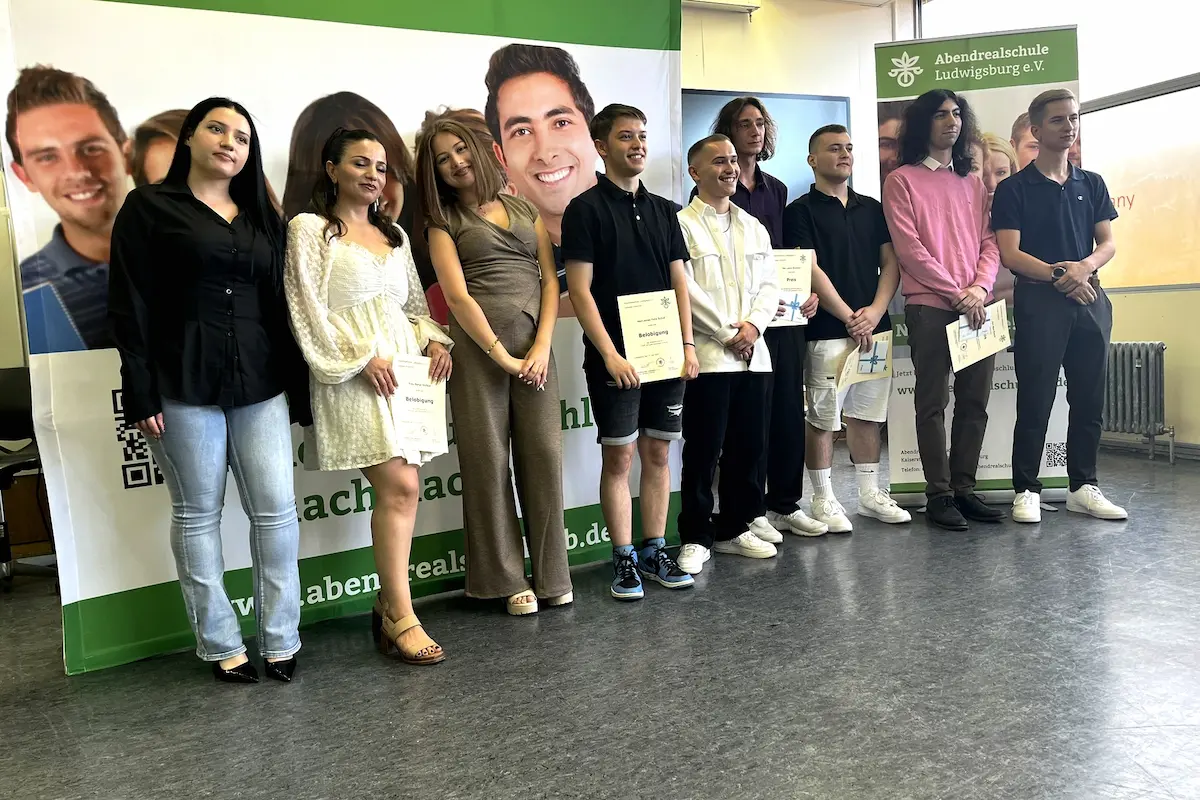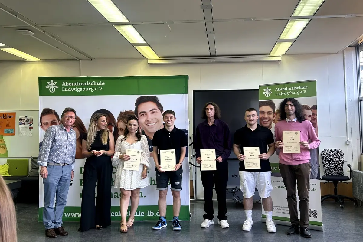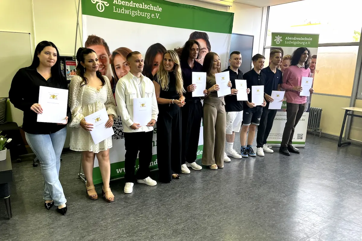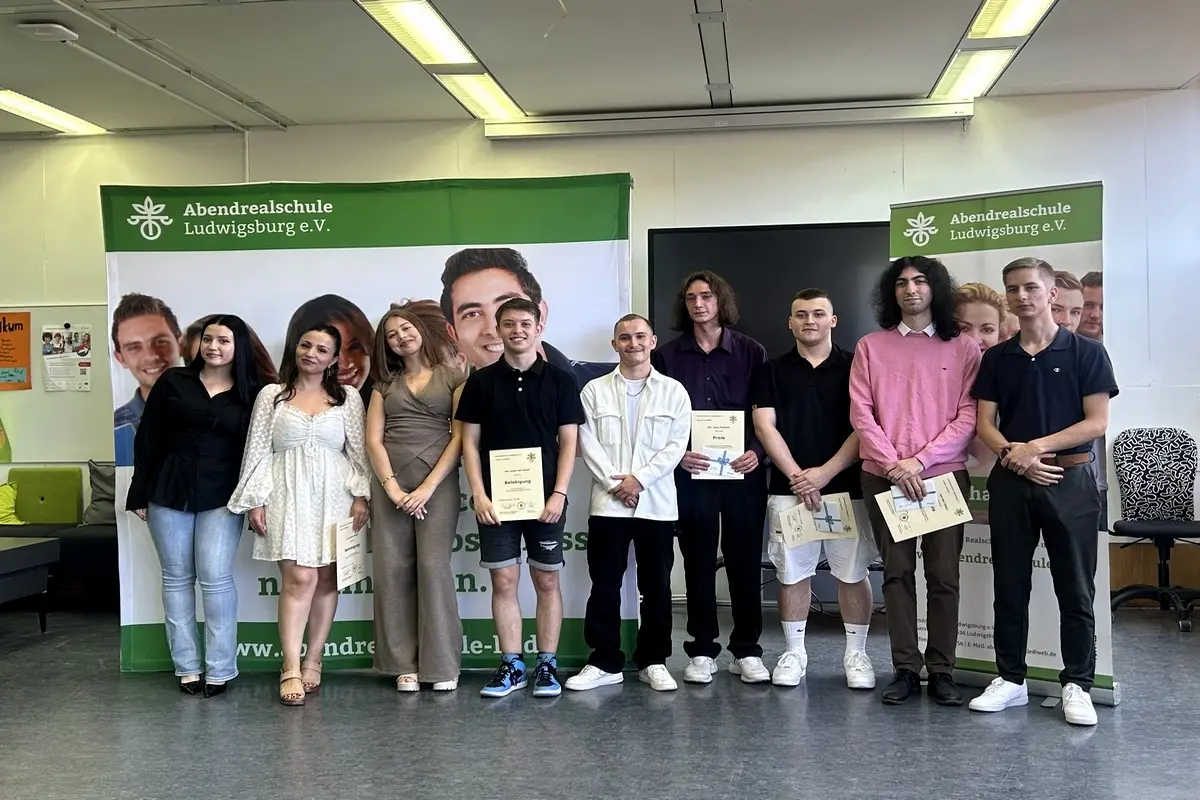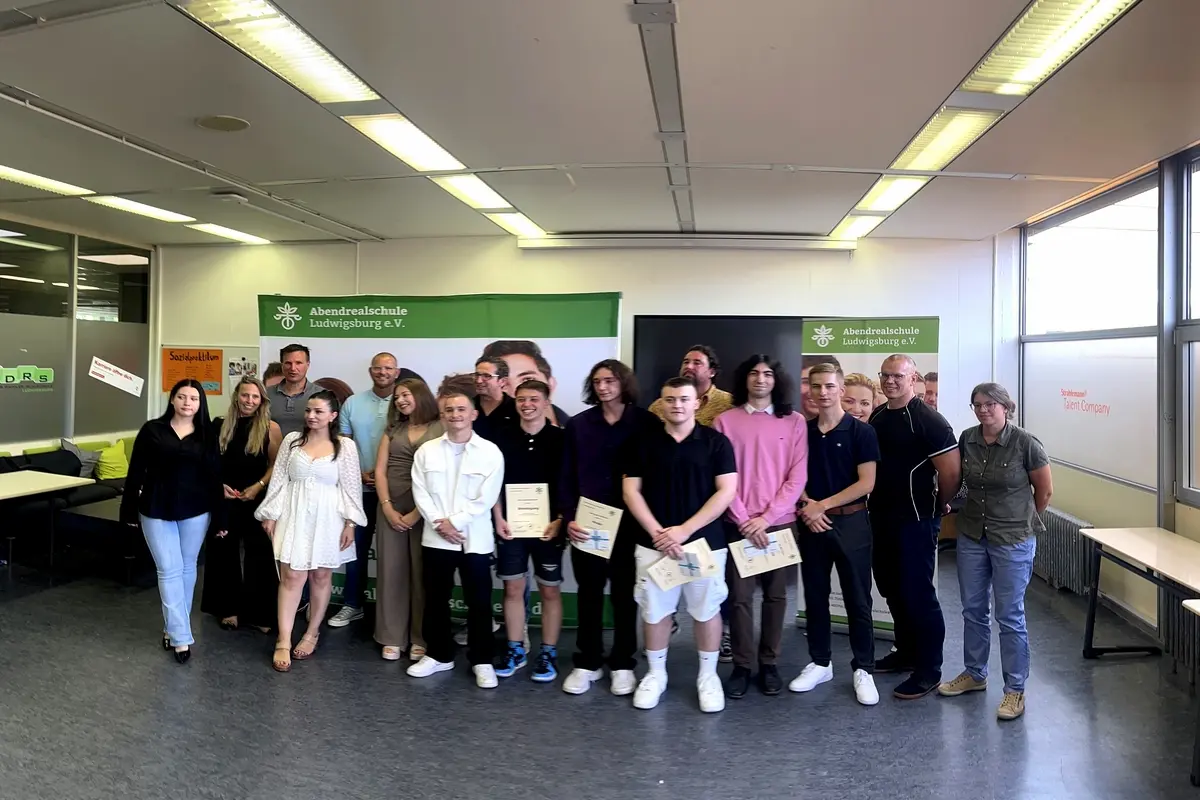 Mit strahlenden Gesichtern feierten die Absolventen in diesem Jahr ihren erfolgreichen Abschluss an der Abendrealschule Ludwigsburg. In zwei Jahren mit Unterricht am Abend und zumeist einer beruflichen Tätigkeit tagsüber zeigten die Schülerinnen und Schüler Ausdauer und Fleiß, um das Ziel zu erreichen. Mit einem Glas Sekt ließ sich trefflich darauf anstoßen, dass sich nun neue berufliche Möglichkeiten auftun. Bei dem einen war die Bewerbung auf eine berufliche Ausbildung erfolgreich, beim anderen geht es weiter mit einer schulischen Ausbildung in Richtung Abitur.